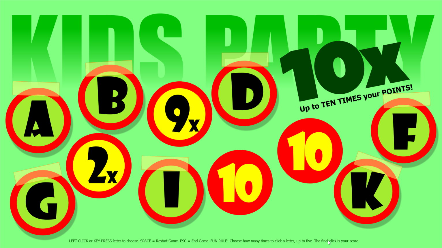10x. Use this game to multiply the number of points kids earn when you draw names from a bucket, for example. Kids choose a letter for you to click. Multipliers range from 2x to 10x. A player that starts with 1000 points can multiply that up to 10,000 points. And remember, players that earn points earn the same amount for their teams!