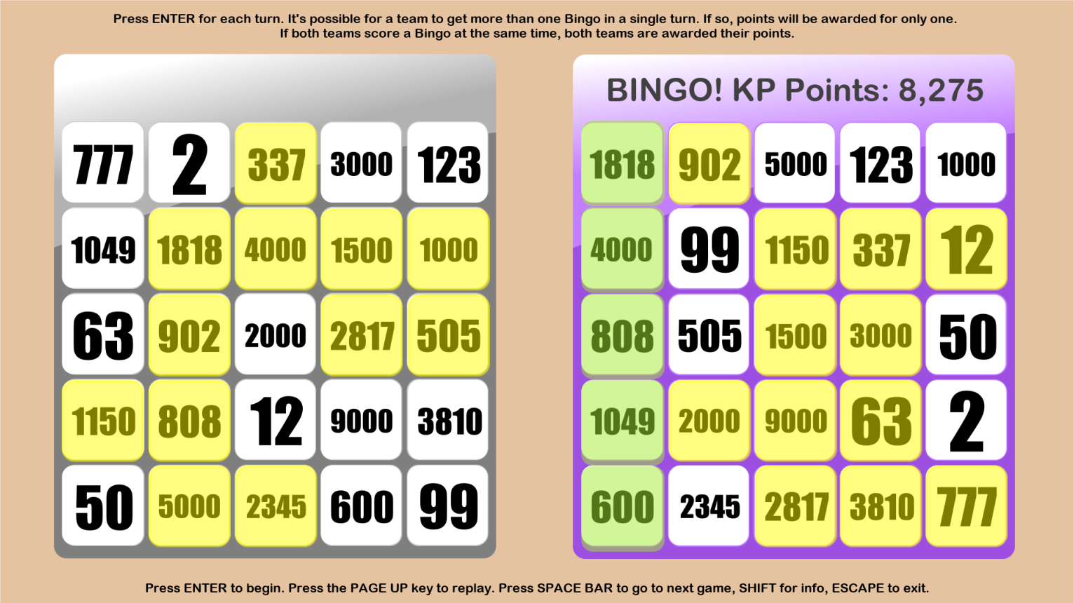 KP Points Bingo. No matter how many KP teams you’re running, have them choose up sides for this two-team game. The winning team (or teams) gets all the KP Bingo points. If you wish, you can keep playing until the other side also scores a Bingo. A huge number of possible outcomes (well beyond trillions). You will literally never play the same game twice in a lifetime of playing!