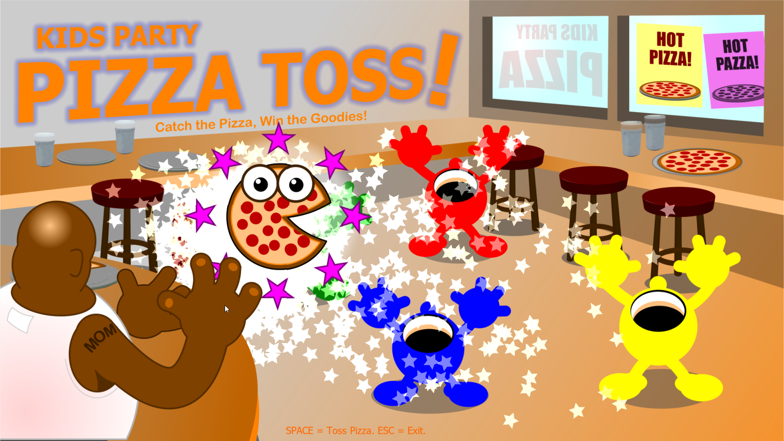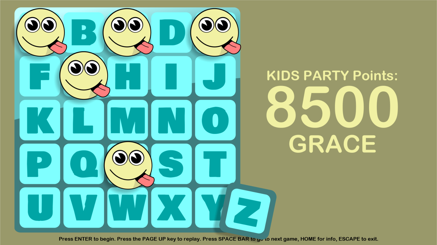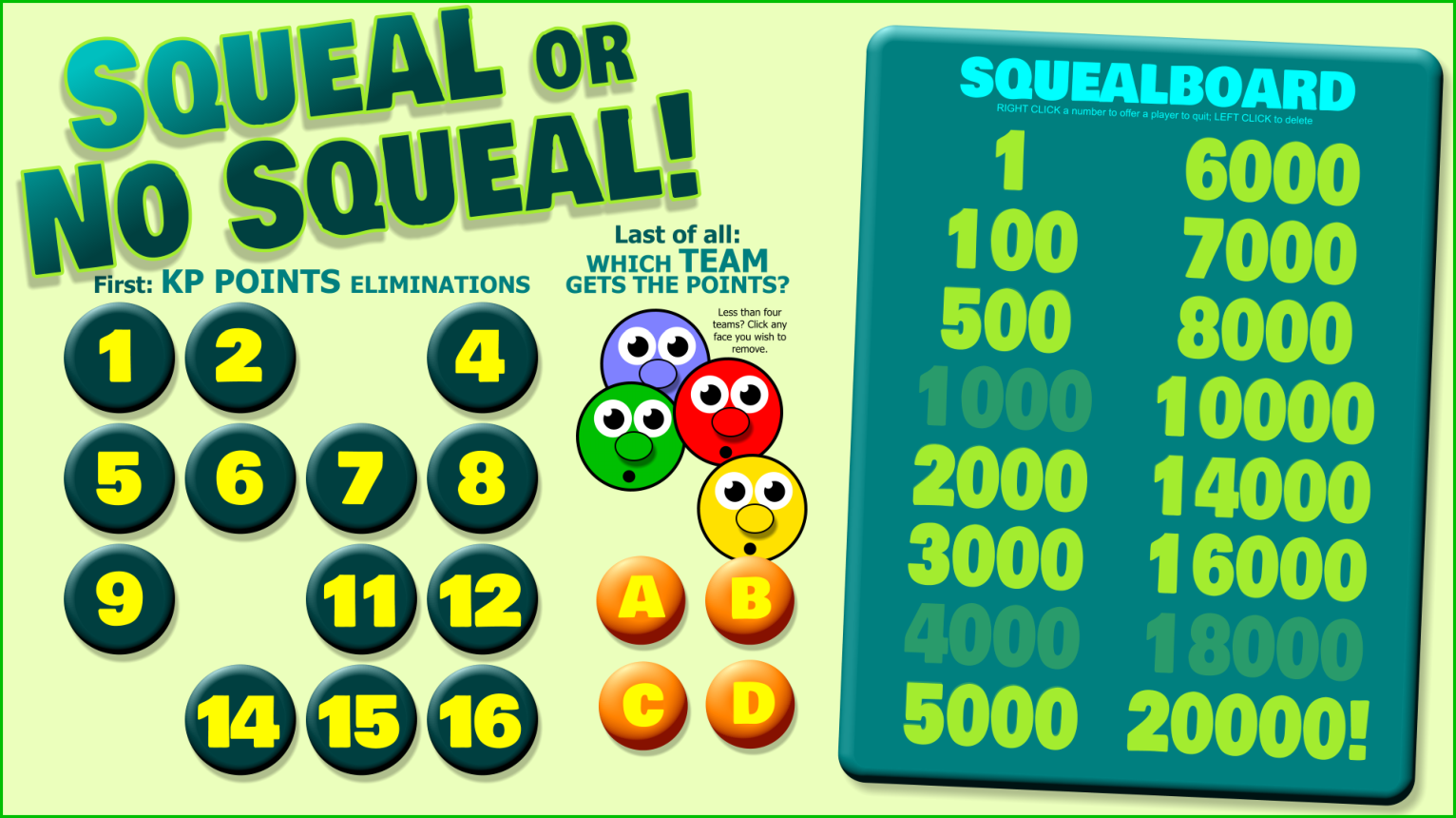 Squeal or No Squeal! A great way to end KIDS PARTY events, and saves the set-up time required by the paper version found in the Kids Party resources Wallgames 1 and Wallgames 2. This is the one exception to the rule that KP Watchables games require practically no time or the adult leaders to learn. This one you need to understand before you start it up for the kids. Happily, just press the Escape key to find the instructions.
