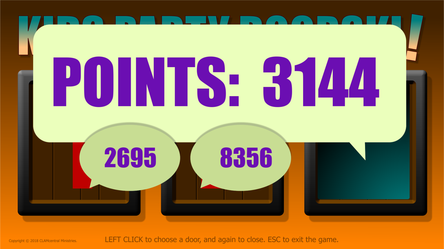 Doorski! Draw somebody’s name from a hat and let them indicate which number door for you to click. Instant points for that kid and his or her team. Super quick, you can play it several times in a row. The two smaller balloons show the points behind doors not chosen. It doesn't matter if players pick the same door multiple times in a row, the points are always randomized from 0000 to 9999.