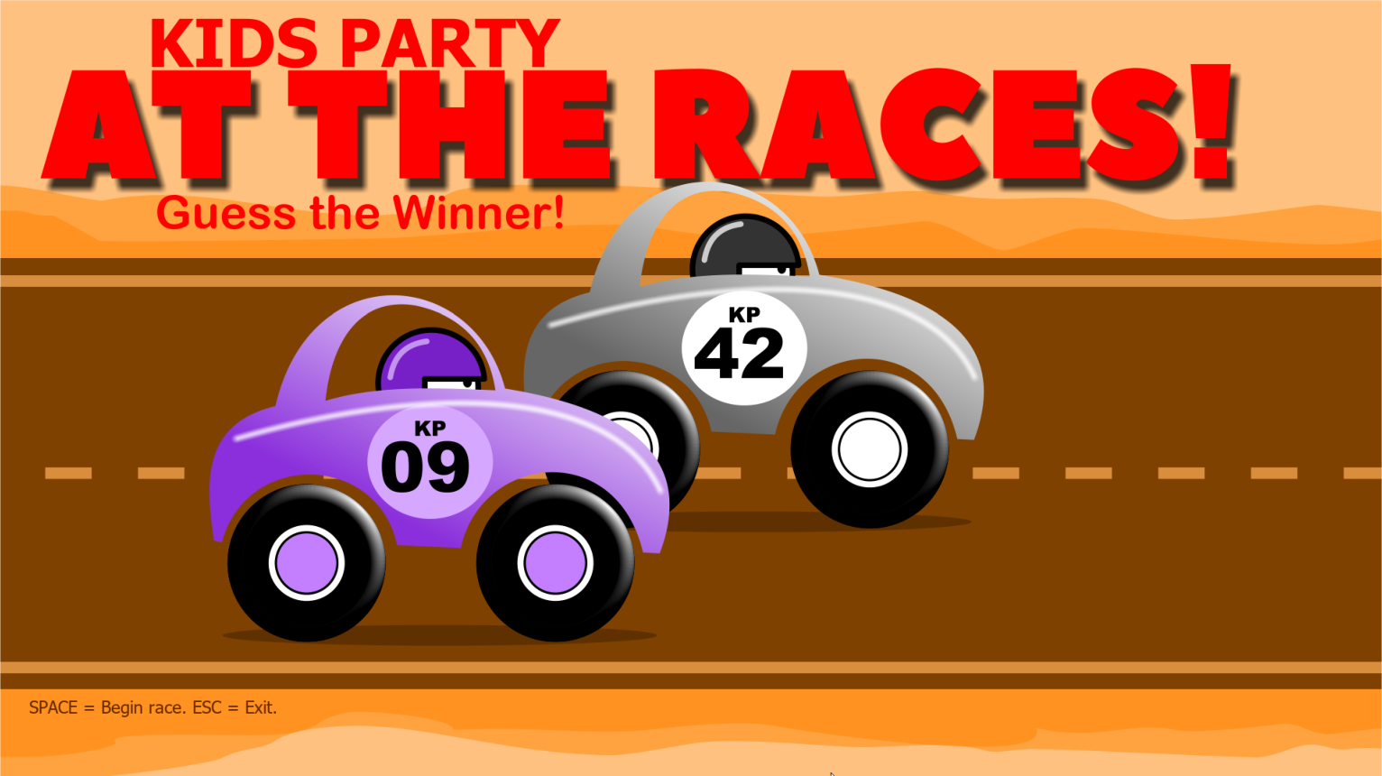 At the Races! Teams earn points if they correctly predict the winning car. This one gets them shouting! Play several rapid-fire rounds: Each race lasts for about ten seconds or less. Teams can switch cars or not after each race. You'll need someone to add up the number of races each team wins.